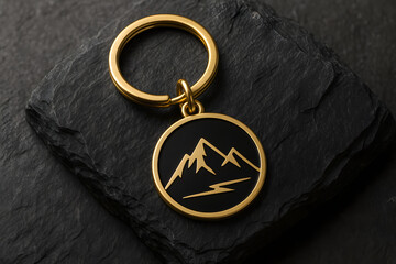 Elegant gold keychain featuring mountain logo design for branding, accessory, or adventure-themed product visuals
