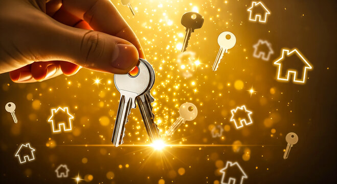 Hand holding a set of keys with houses and golden sparkles, symbolizing real estate, home ownership, and investment opportunities.