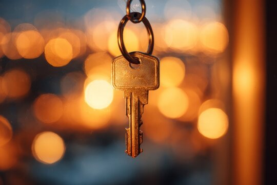 A close-up of a sleek golden key hanging against a dark background, symbolizing access and mystery. An essential item filled with potential and unanswered questions.