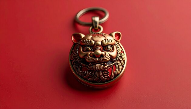 Golden Lion Head Keychain on Red Background - A Symbol of Protection.