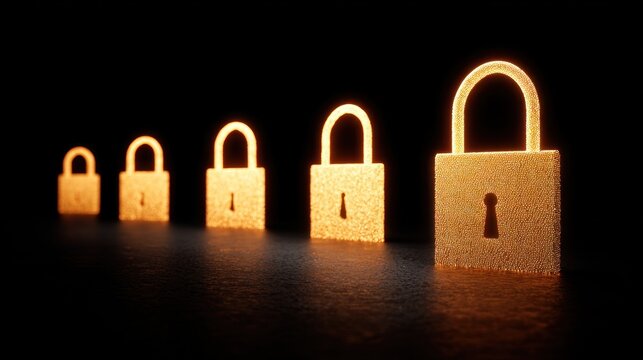 A row of golden, glowing padlocks with a black background.