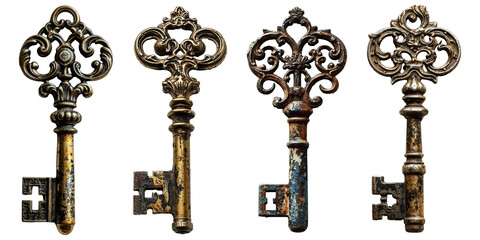 Set of vintage golden keys isolated transparent background. PNG collection