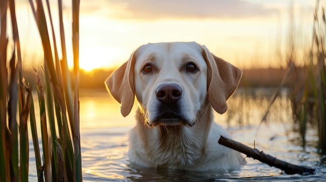 Serene Labrador Retrieving Stick in Water at Sunset Surrounded by Reeds in a Calm Natural Environment with Soft Golden Light Reflecting on Surface