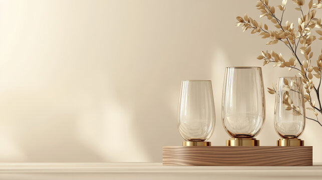 Glass trophy with laurel on wood stand with golden plate. Realistic vector set of transparent plexiglass crystal award on wooden base. Mockup of blank glossy acrylic winner prize cup on pedestal.