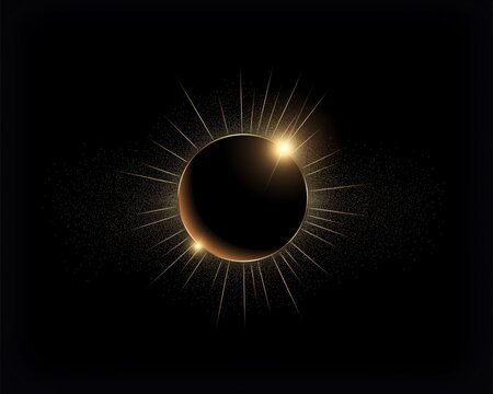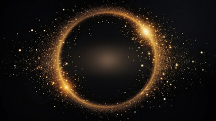 Luxury black background, particles golden glitter in form ring, circle. Shining gold frame, place for text. Awards ceremony. Festive round border. Beautiful background gold. Decorative solar eclipse