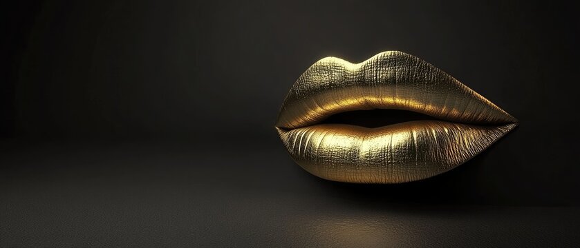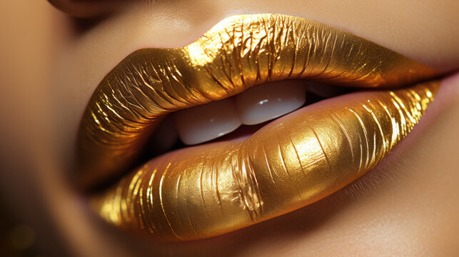 Abstract gold lips. Golden lips closeup. Gold metal art lip. Beautiful makeup. Golden lip gloss on beauty female mouth, closeup. Mouth Icon.