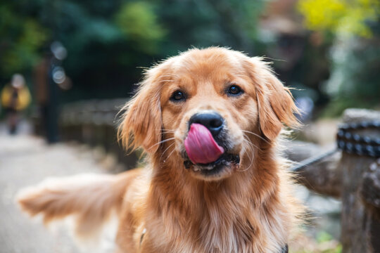 golden retriever dog lick lip and wait for food at Minoh waterfall in fall