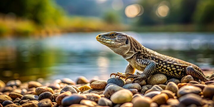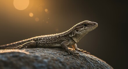 Lizard basking on rock with vibrant sunlight and golden horizon background