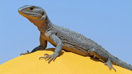 A large lizard basks in the sun atop a dune, its scales shimmering under the bright light.  The desert landscape stretches out behind it, a vast expanse of golden sand under a clear blue sky.