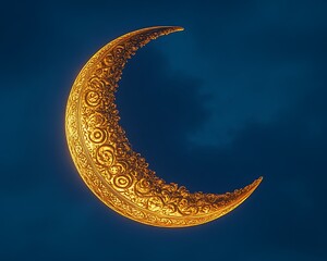 Golden crescent moon embracing a golden mosque background Eid Mubarak and Ramadan Kareem greetings with Islami