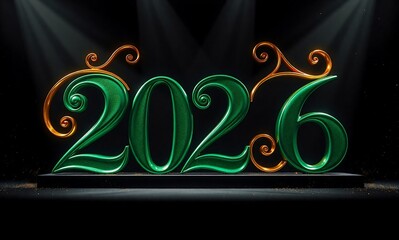Elegant green metallic numerals with golden flourishes, illuminated by spotlights on a dark stage, symbolizing a future celebration.