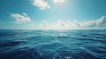 A bright sun hangs in a clear sky, casting a golden light over the vast expanse of ocean water below. The water reflects the sunlight, creating a beautiful shimmering effect on the surface.