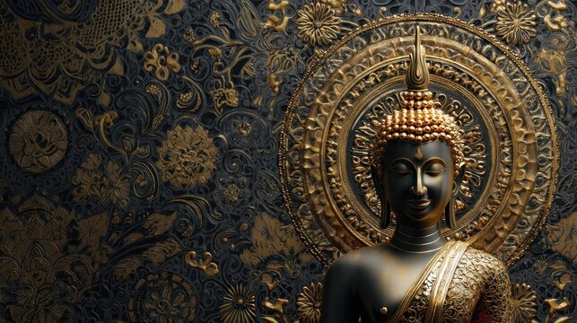 A golden Buddha statue with intricate gold and black patterns on a blue and gold floral background.