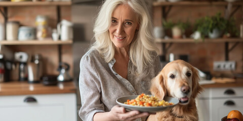 A retired senior lady enjoys a meal with her pet golden retriever at home.