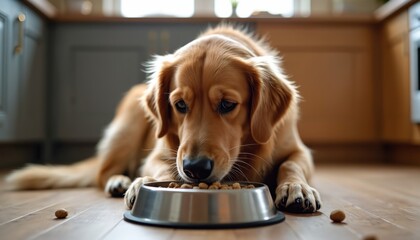 Golden retriever dog eats dry kibble from steel bowl on wood floor. Focused pet enjoys its meal in modern kitchen environment. Healthy doggy nutrition.