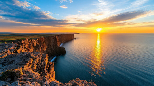 Golden sunset illuminates a rugged cliff face overlooking a calm, blue ocean.