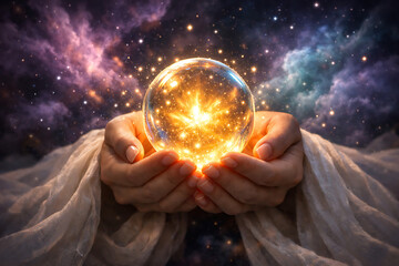 Magical glowing orb filled with golden sparkles held in hands against a vibrant nebula space background representing cosmic energy and mystery of the universe