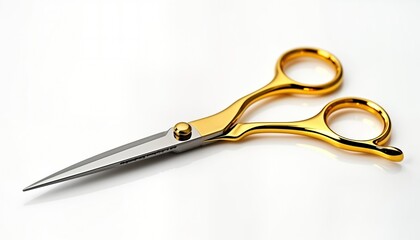 Pair of sharp metal scissors with golden handles. Tools for cutting hair fabric. High-quality equipment for professionals. Symmetrical design. Isolated object on white background. Elegant, precise