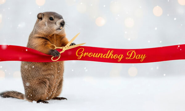 A cute groundhog is holding golden scissors in his hands to cut a red festive ribbon. Groundhog Day celebration concept