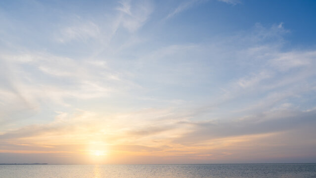 Sunset sky clouds over sea in the evening with orange, yellow sunlight, Horizon sea landscape background and sun down in golden hour summer season, Dusk