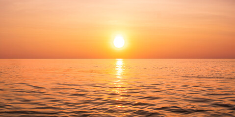 Beautiful orange sunrise sky background over sea with yellow sunlight reflection on sea surface in golden hour time, panoramic view