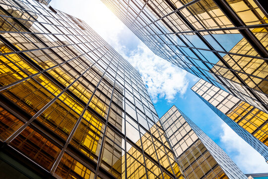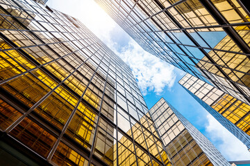 Modern glass skyscrapers reflecting evening sky in cityscape