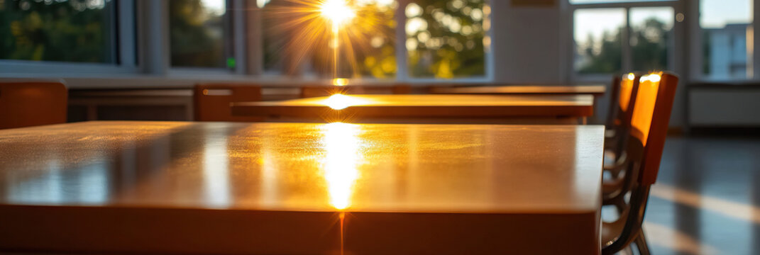 Empty classroom with golden sunlight and wooden desks