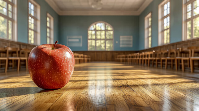 Vibrant red apple rests on gleaming wooden floor, bathed in golden sunlight within empty, nostalgic school hall, lined with rows of vintage chairs and large windows