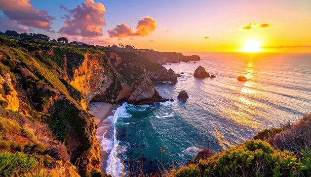 A breathtaking coastal sunrise, with golden sunlight illuminating waves crashing on the sandy shore, creating a tranquil and vibrant scene.
