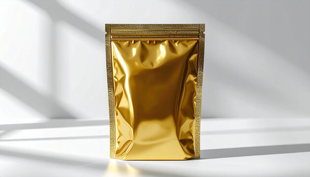 Luxury golden foil stand-up pouch mockup with zipper against white backdrop with subtle shadows