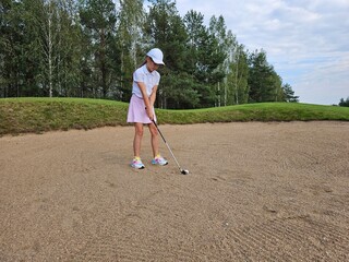 Female golfer walking on lush green golf course in summer