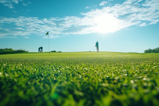 Golfers enjoying leisurely game puttting on sunny course