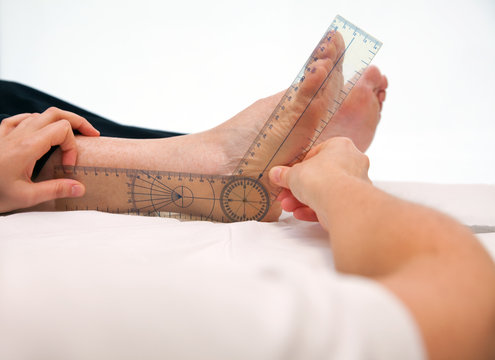 Female physiotherapist examining knee angle of patient with goniometer. on the background of a white wall in the hospital