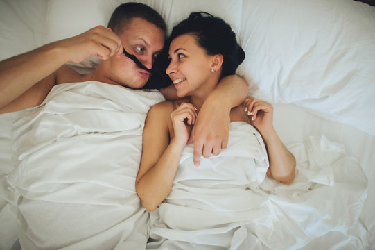 Good Night. Cute Smiling Girl Lying Under Blanket in Bed Wishing Good Night to Mother