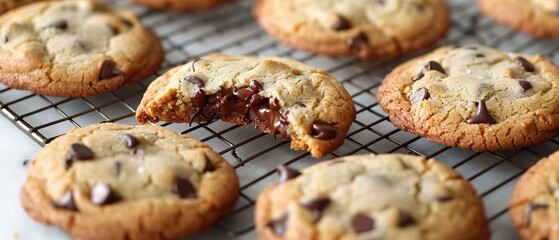 Chocolate chip cookies on a cooling rack, with one broken open to show gooey chocolate