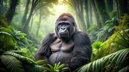 A powerful and majestic gorilla sitting in the lush jungle , animal, wildlife, mammal, zoo, aggressive, nature