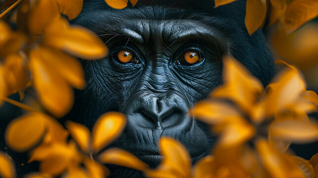 A gorilla peers through dense foliage, its wise eyes reflecting the deep intelligence and complexity of these incredible primates.