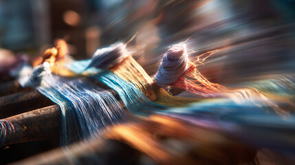 Close-up of threaded hand loom in solar-powered workshop