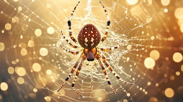 Glistening orb web with dew droplets in warm backlight, sunlit radial silk macro