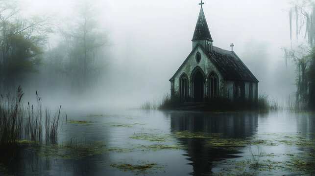 A sunken chapel in a swamp, its steeple barely visible above the mist.