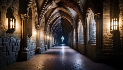 moody dimly lit gothic corridor with pointed arches and stone walls evoking mystery history and ancient architectural grandeur
