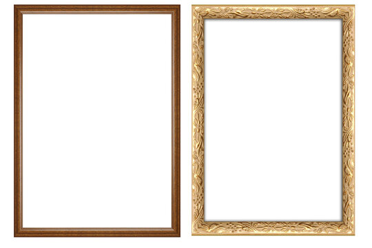 Set of golden and wooden gothic frames for paintings, mirrors or photo isolated on white background