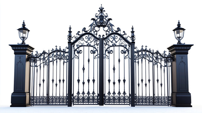 Ornate black wrought iron gates with a majestic gothic design, featuring intricate patterns and arches
