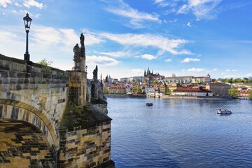 Charles bridge, Old Town Bridge Tower, Medieval stone arched bridge over the Vitava River and the Castle with the Cathedral, Prague, Bohemia, Czech Republic