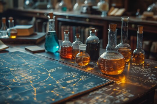 Colorful magic potions in glass bottles on wooden table. Halloween still-life background with different elements on dark toned background.