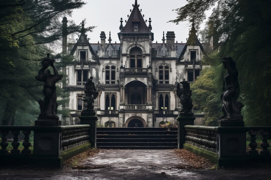 Haunting remnants dilapidated victorian style manor with crumbling stone walls and overgrown vines cobweb covered windows and a crooked. Dark Gothic Manor. Illustration