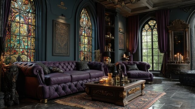 Gothic manor interior with ornate window showing heavy rain and antique furniture