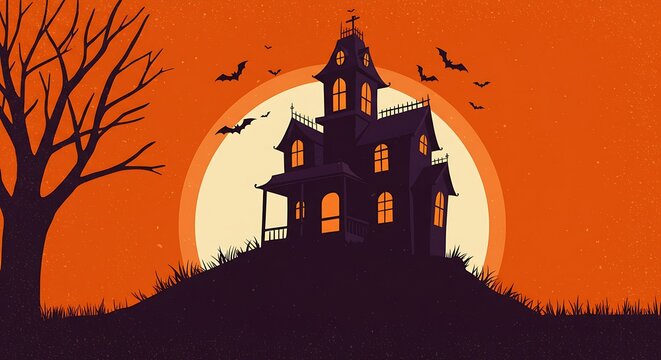 Eerie haunted manor stands atop a dark hill under a glowing orange harvest moon, with bats flying in the night sky. A spooky Halloween vector