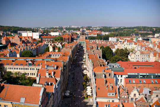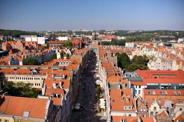 Aerial view of Gdansk Old Town rooftops and main street in Poland
