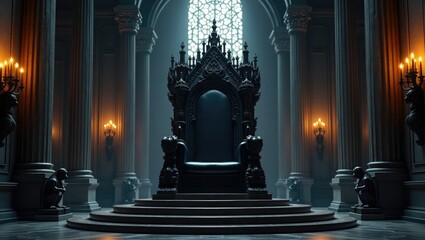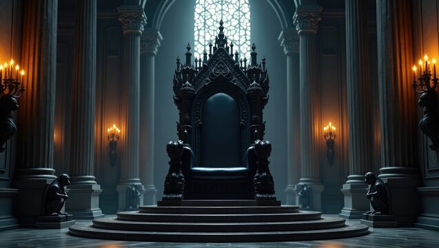 Majestic gothic dark fantasy hall with throne, torches, perfect for mediaeval fantasy settings. Eerie castle interior with stone walls, candle light creating atmospheric mood. Grand palace with